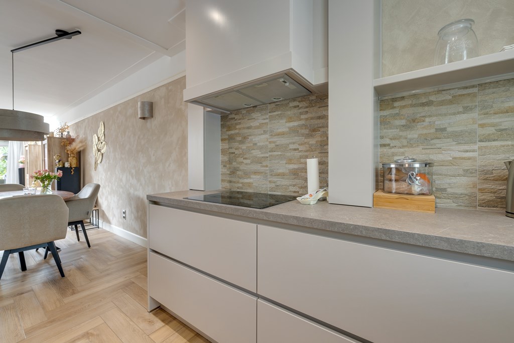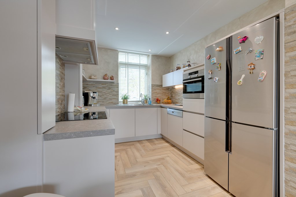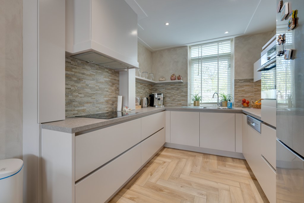 De open keuken aan de voorzijde is strak afgewerkt en voorzien van alle benodigde inbouwapparatuur. De gehele begane grond is voorzien van een stijlvolle PVC-vloer met vloerverwarming.