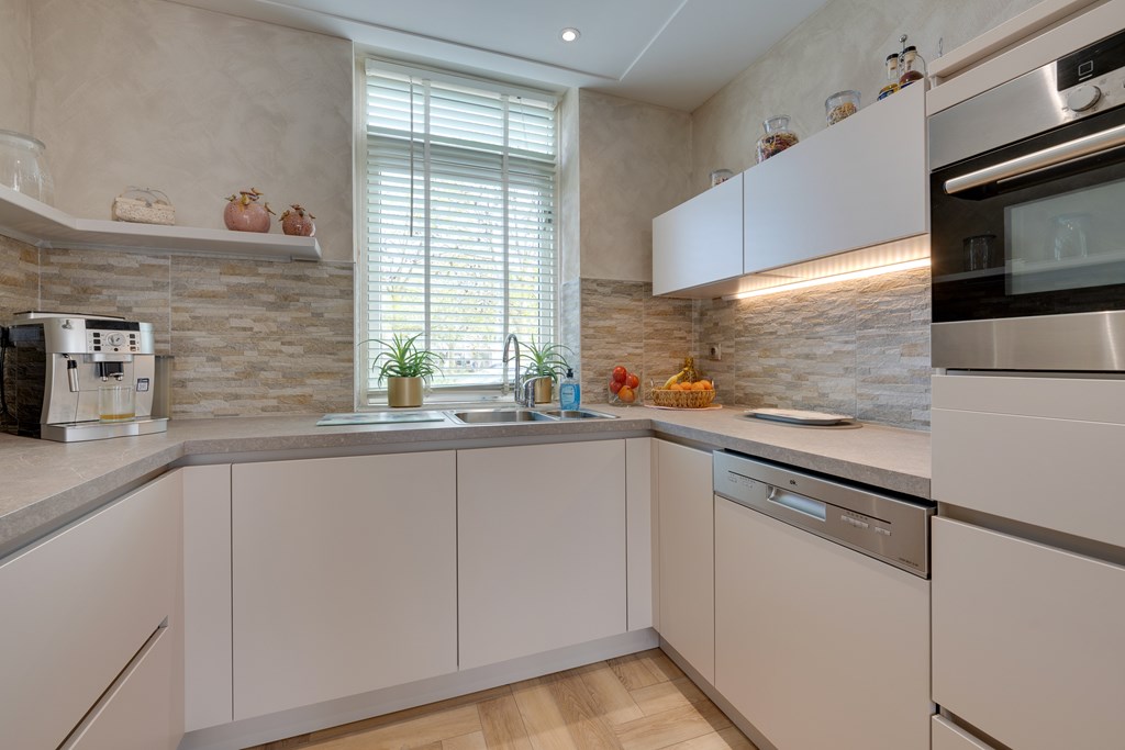 The open kitchen at the front is sleekly finished and equipped with all the necessary built-in appliances. The entire ground floor features a stylish PVC floor with underfloor heating.