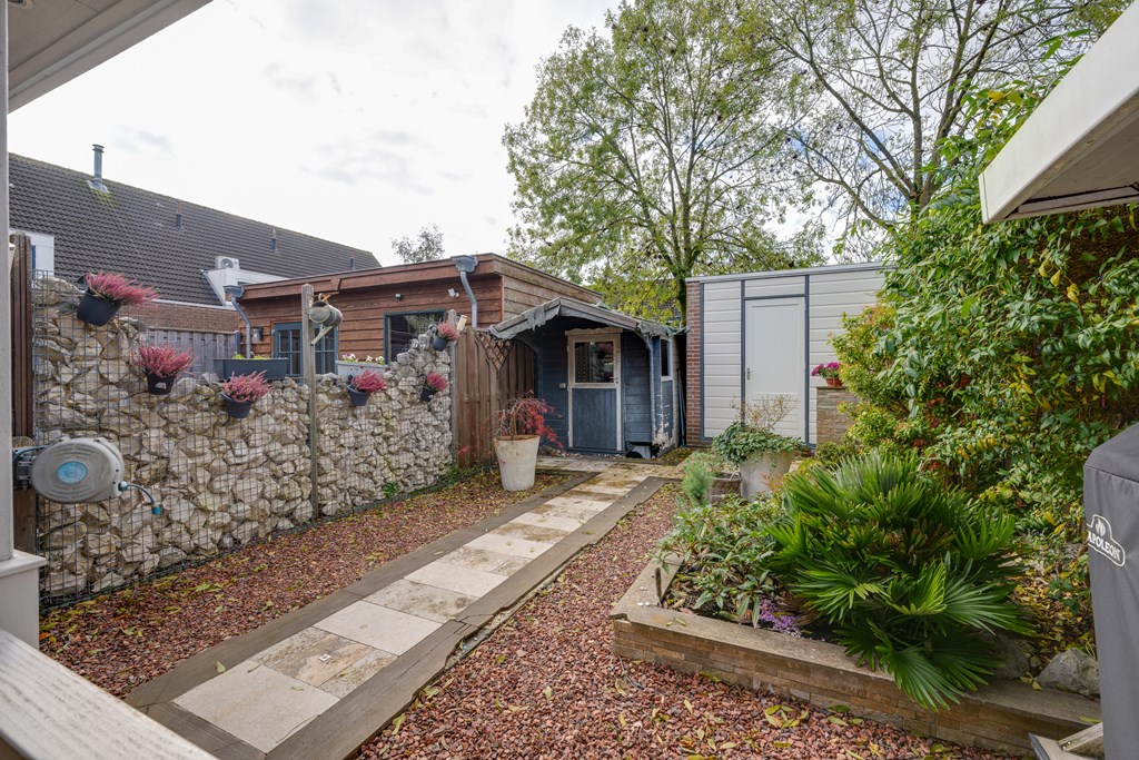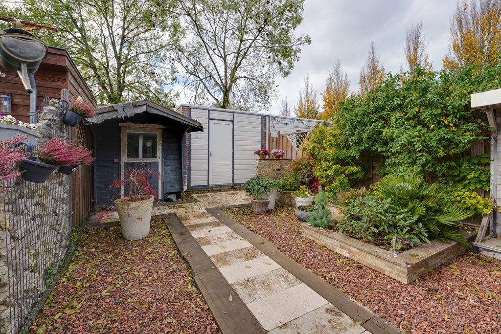 De zonnige achtertuin met berging en achterom ligt op het zuidwesten – perfect om te ontspannen of gezellig buiten te eten.