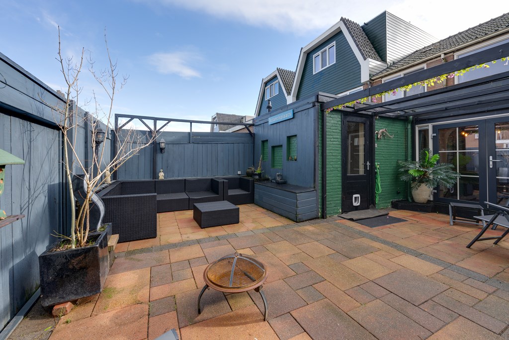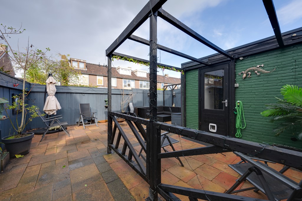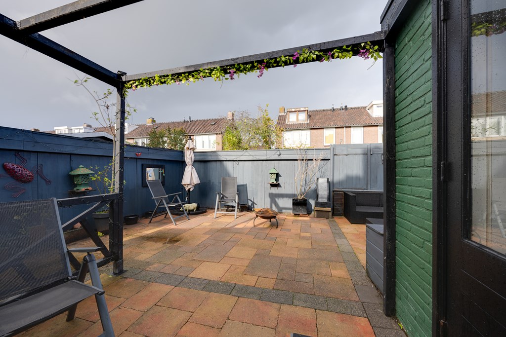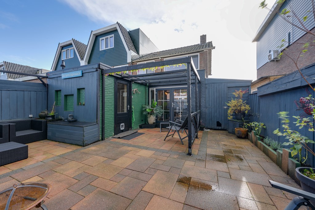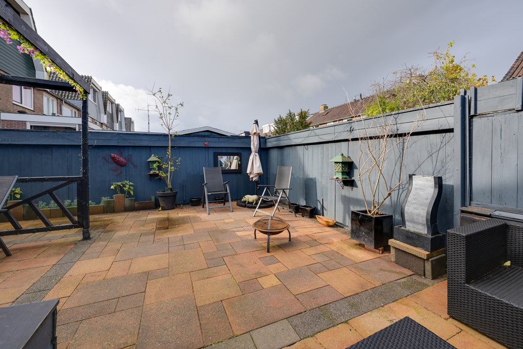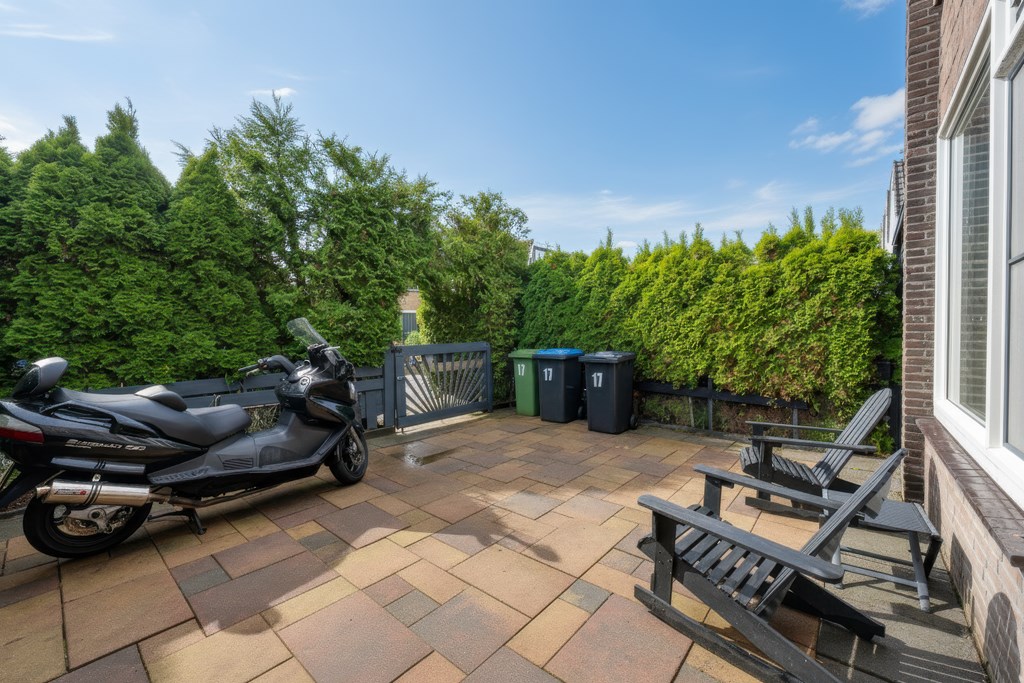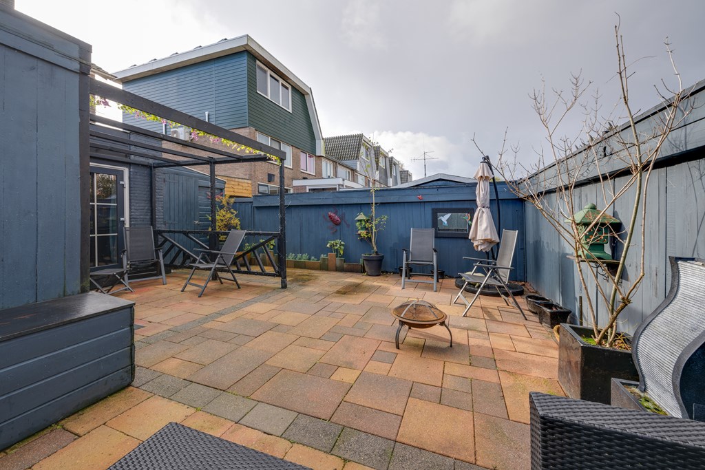 De ruime achtertuin ligt gunstig op de zon en biedt volop privacy. Dankzij de hoekligging is er extra buitenruimte aan de zijkant van de woning, ideaal voor tuinliefhebbers of om een fijne zithoek te creëren. Naast de woning bevindt zich een schuur voor fietsen en tuingereedschap, en er is een achterom aanwezig.