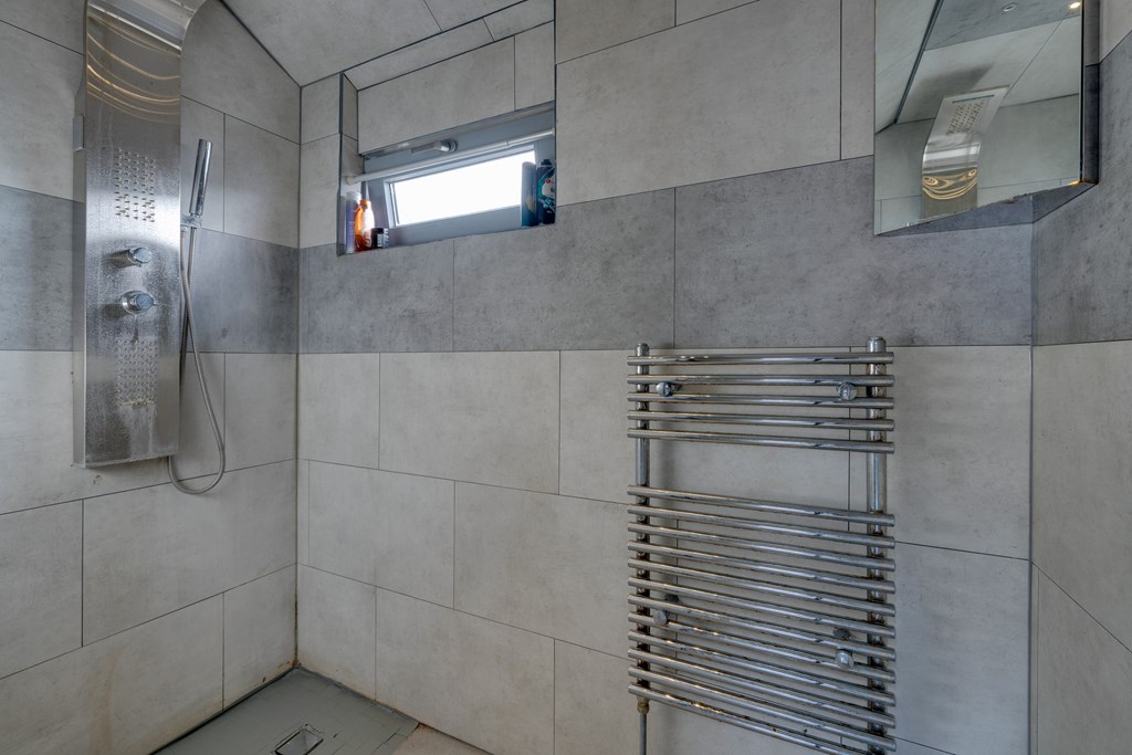 De badkamer is functioneel met een inloopdouche, maar aan vernieuwing toe, een ideale kans om deze geheel naar eigen wens te moderniseren.