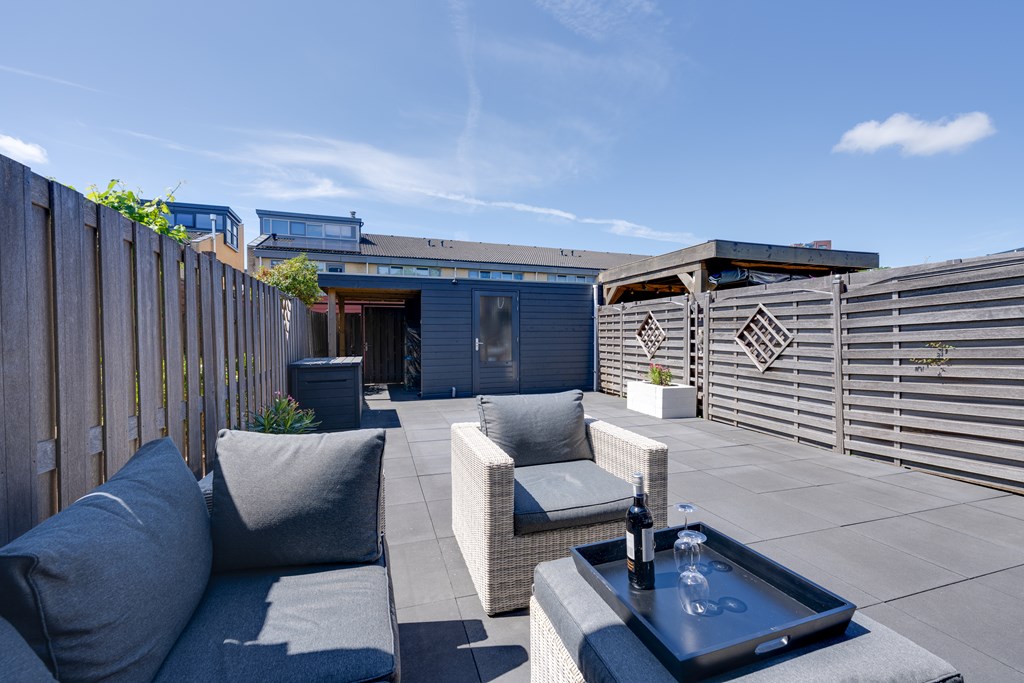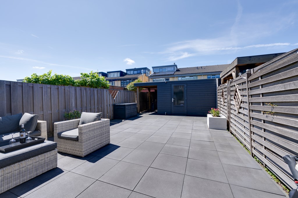 De tuin heeft een overkapping en aparte schuur met voldoende opbergruimte en stalling voor eventuele fietsen. Deze zou je ook nog in de ruime voortuin kwijt kunnen.