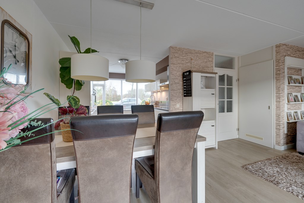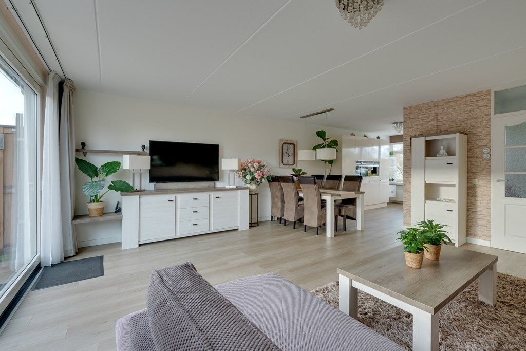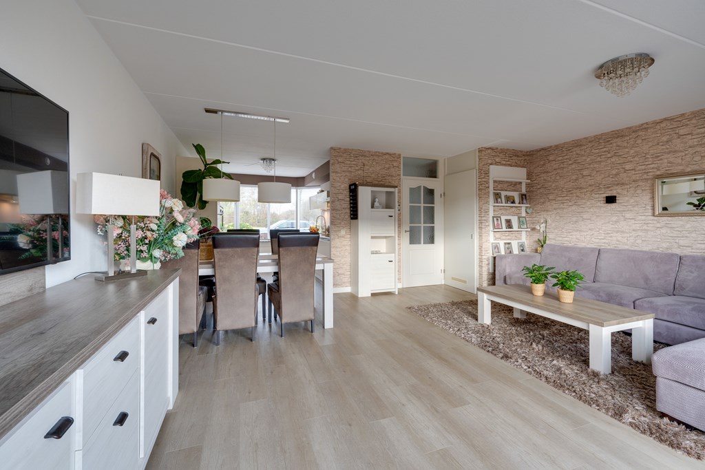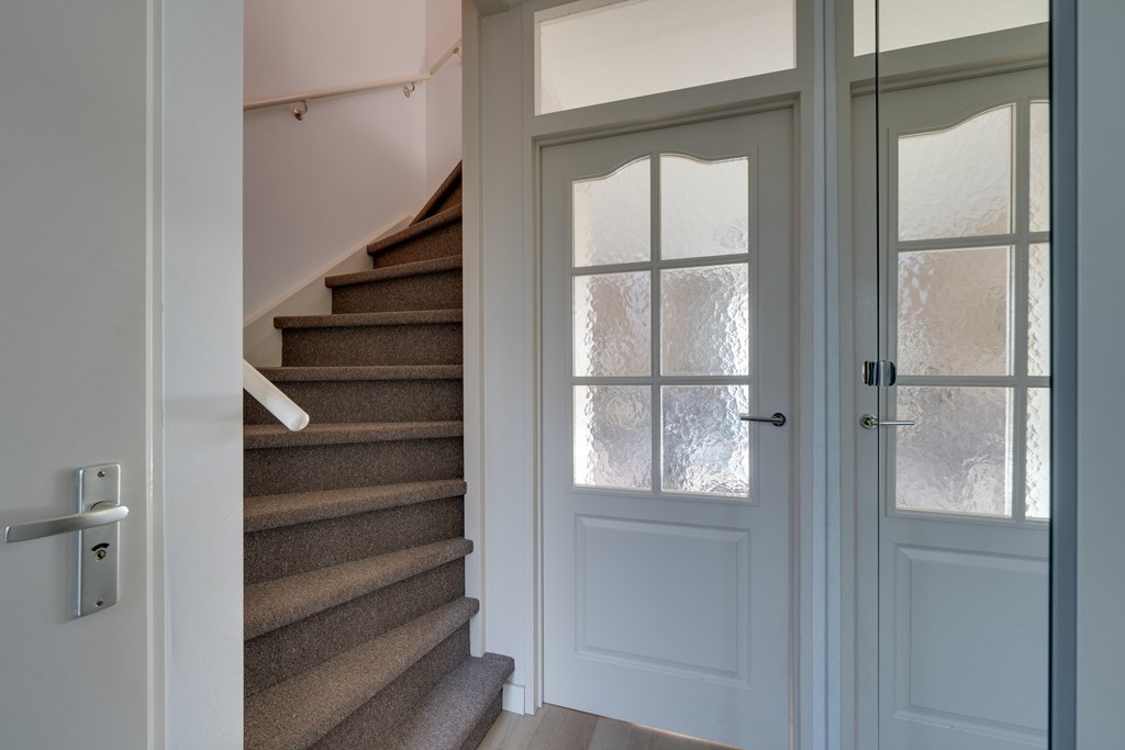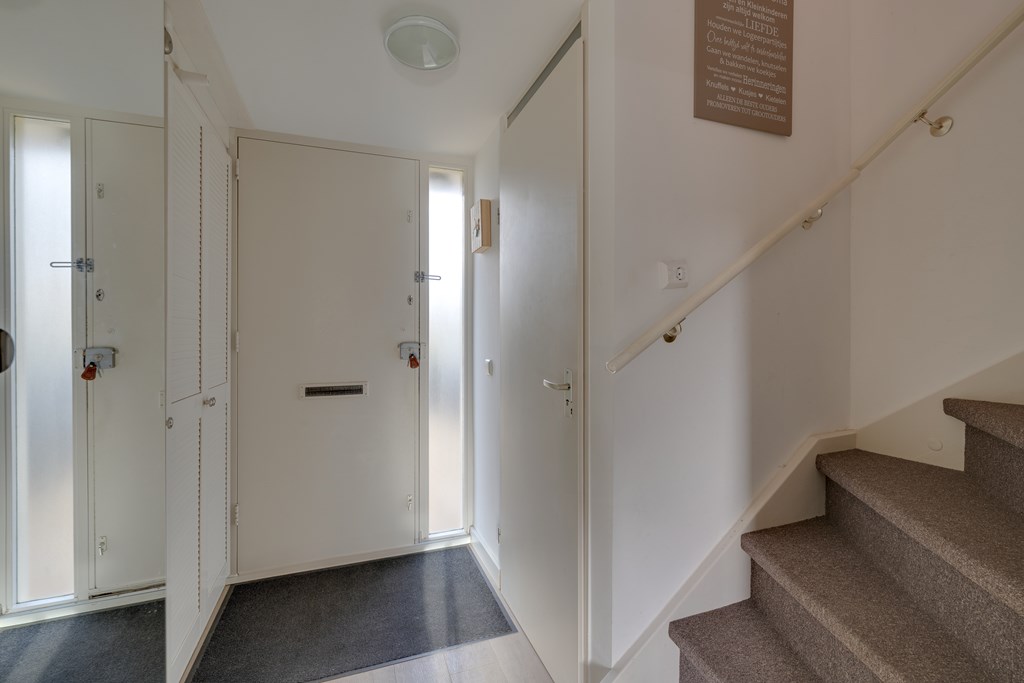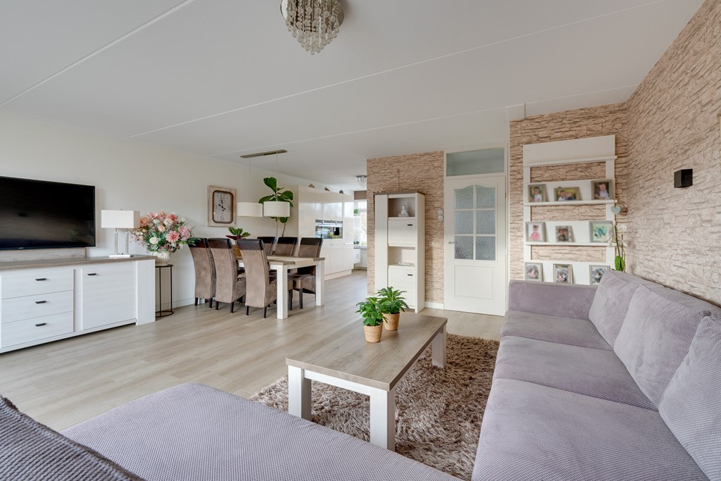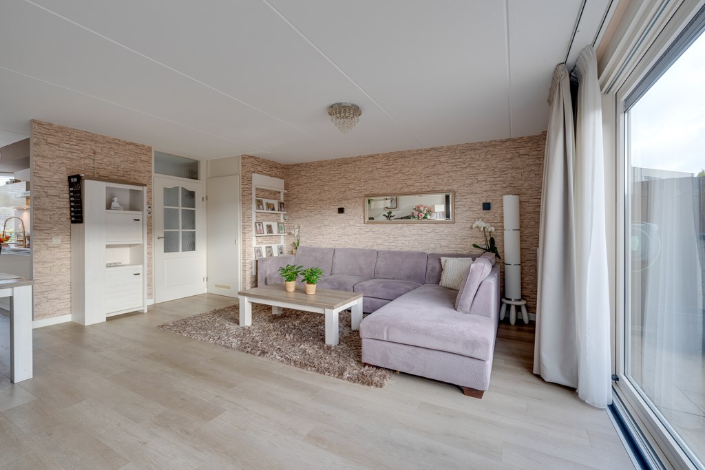 Bij binnenkomst valt direct de verzorgde afwerking op. De hal geeft toegang tot het toilet, de trapopgang en de lichte woonkamer. De woonkamer is ruim opgezet en dankzij de grote raampartijen heerlijk licht. De moderne PVC-vloer op de begane grond zorgt niet alleen voor een warme uitstraling, maar is ook onderhoudsvriendelijk en duurzaam.