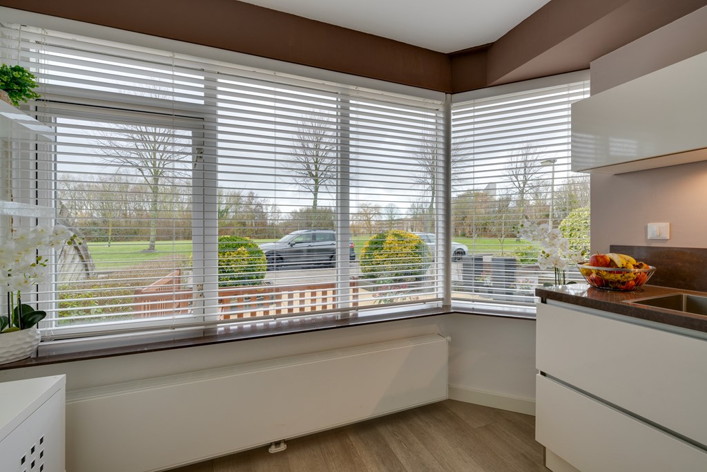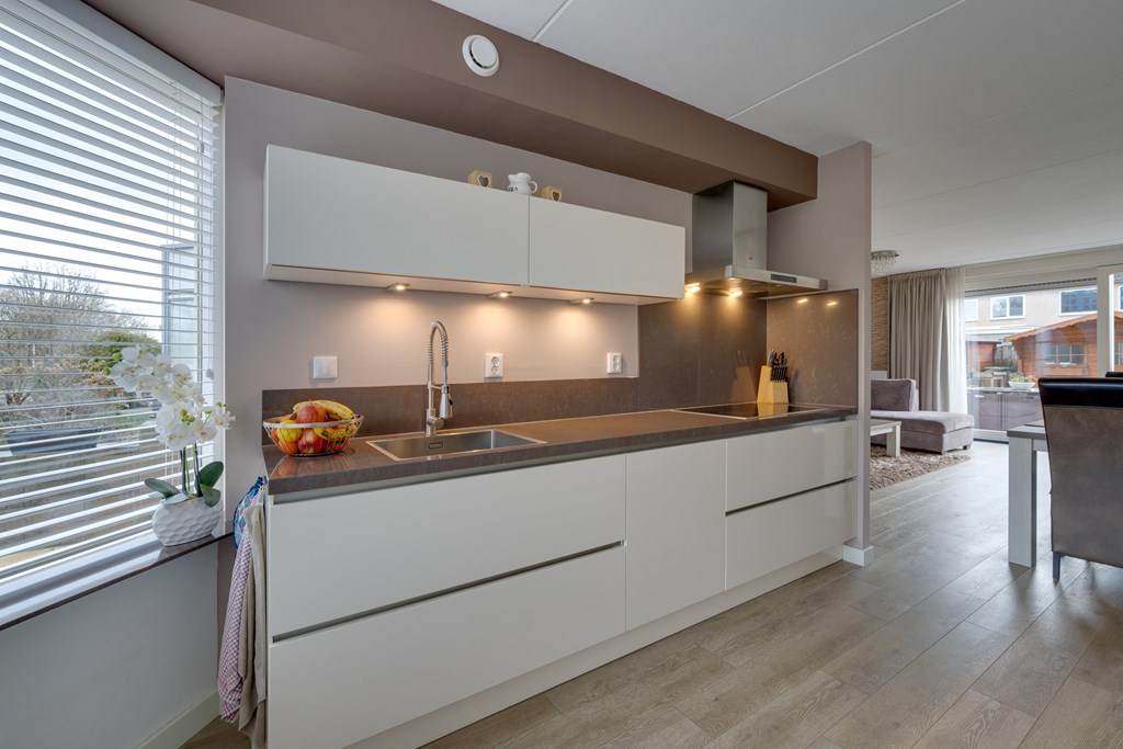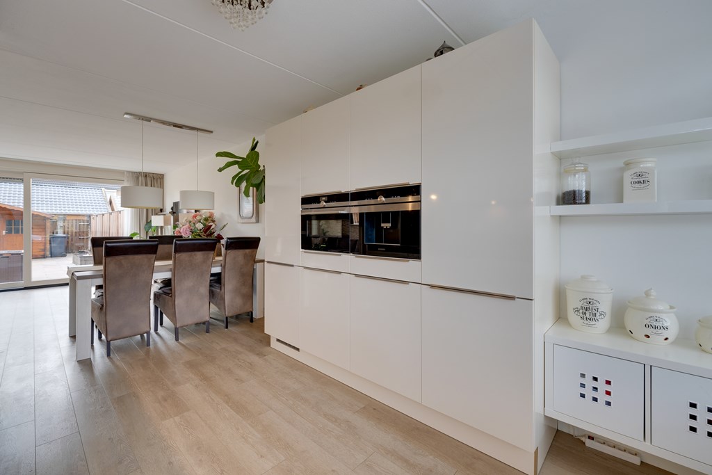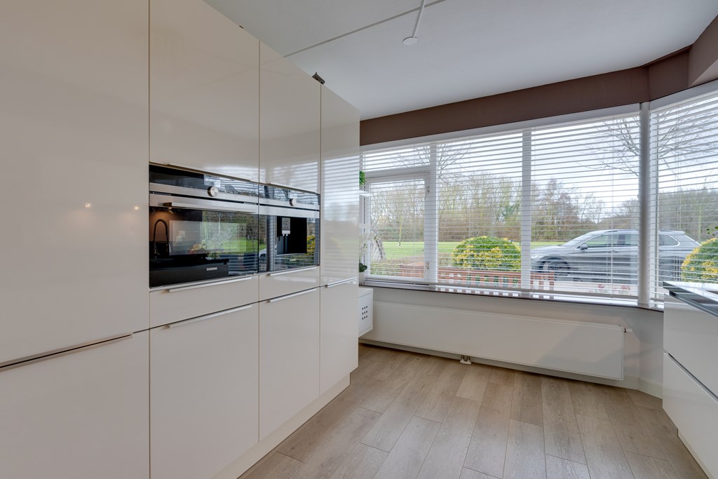 Aan de voorzijde van de woning bevindt zich de prachtige keuken. Deze is modern uitgevoerd en voorzien van diverse inbouwapparatuur van onder andere Miele en Siemens, veel kastruimte en een stijlvol composieten werkblad. De mooie keuken beschikt over een keramische kookplaat met afzuigkap, vaatwasser, koelkast, vriezer, combimagnetron en koffiemachine. Hier kook je met plezier terwijl je uitkijkt op het park.