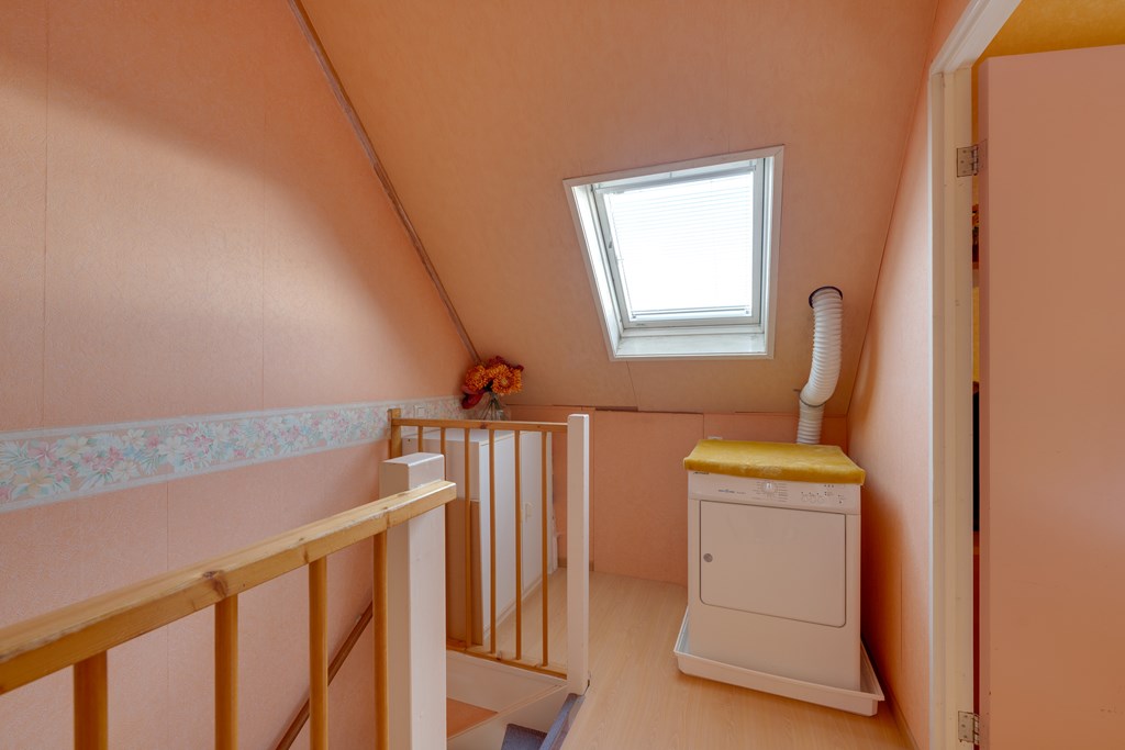 Deze verdieping biedt nog een volwaardige vierde slaapkamer. Daarnaast is hier voldoende ruimte voor een werkplek, hobbyruimte of extra bergruimte. Ook bevinden zich hier de aansluitingen voor wasmachine en droger.