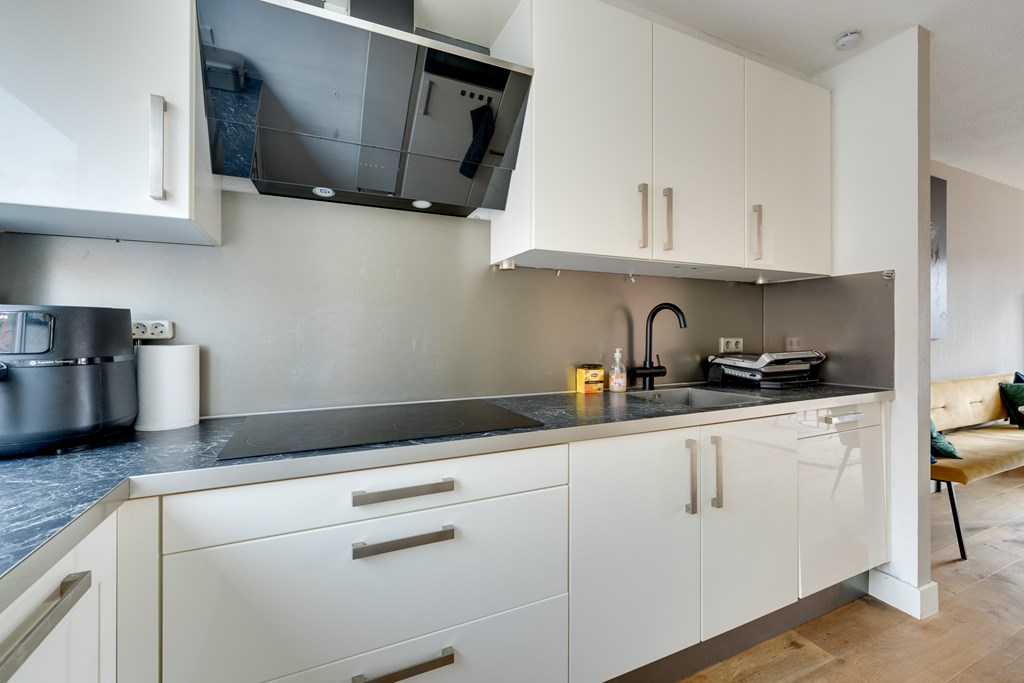 Via de hal met modern toilet en praktische inbouwkasten bereik je de lichte woonkamer. De eikenhouten vloer en strak afgewerkte wanden zorgen voor een warme en tijdloze uitstraling. De luxe keuken is voorzien van een keramische kookplaat met afzuigkap, vaatwasser, stoomoven, koelkast, vriezer, een kunststof werkblad en een kokend waterkraan van het merk Howat.