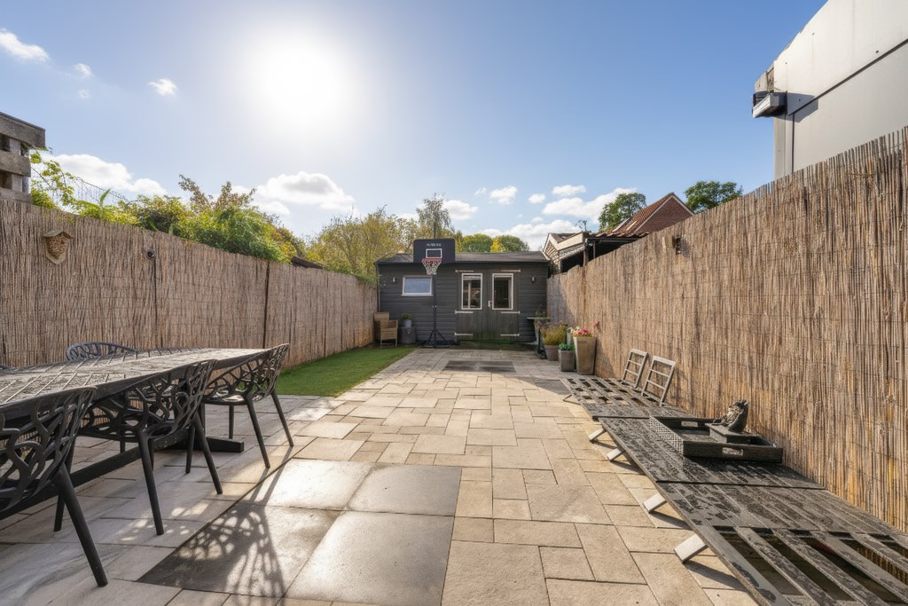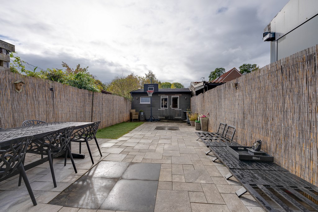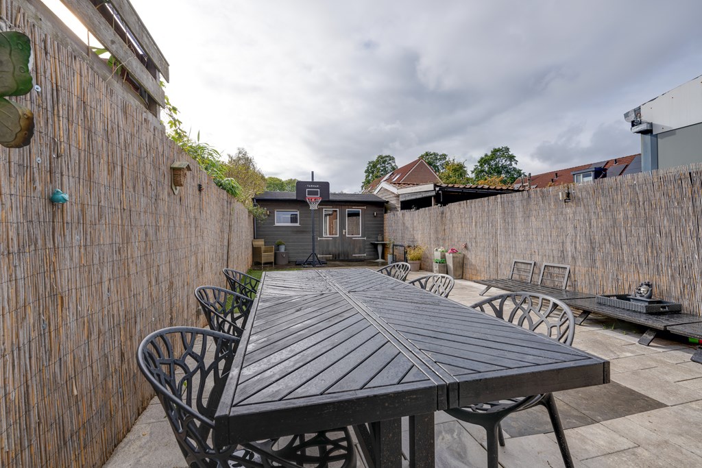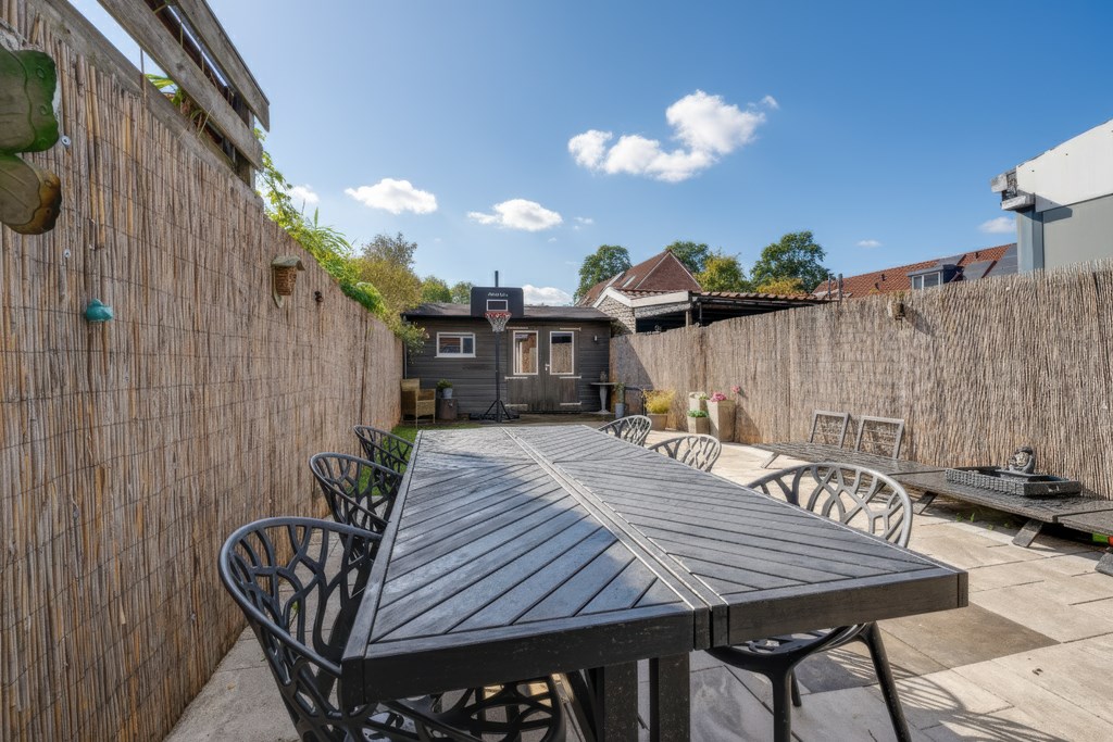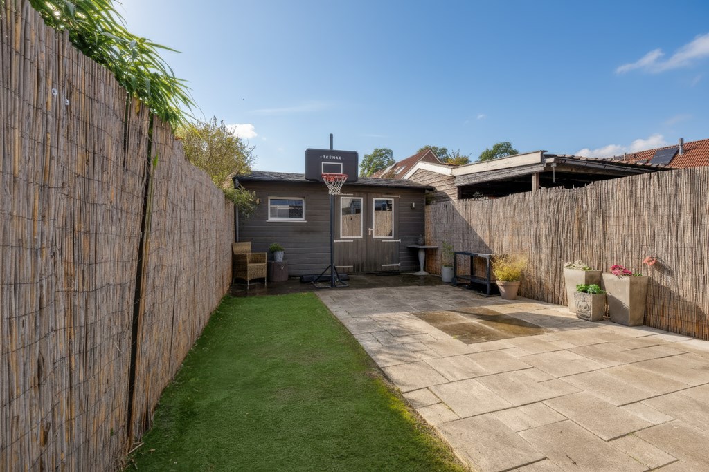 The backyard, approximately 18 meters deep, faces southwest, allowing you to enjoy the sun almost all day long. At the back of the garden, there’s a detached wooden shed offering plenty of storage space. And an added bonus — just behind the garden, there’s a playground where children can play safely.