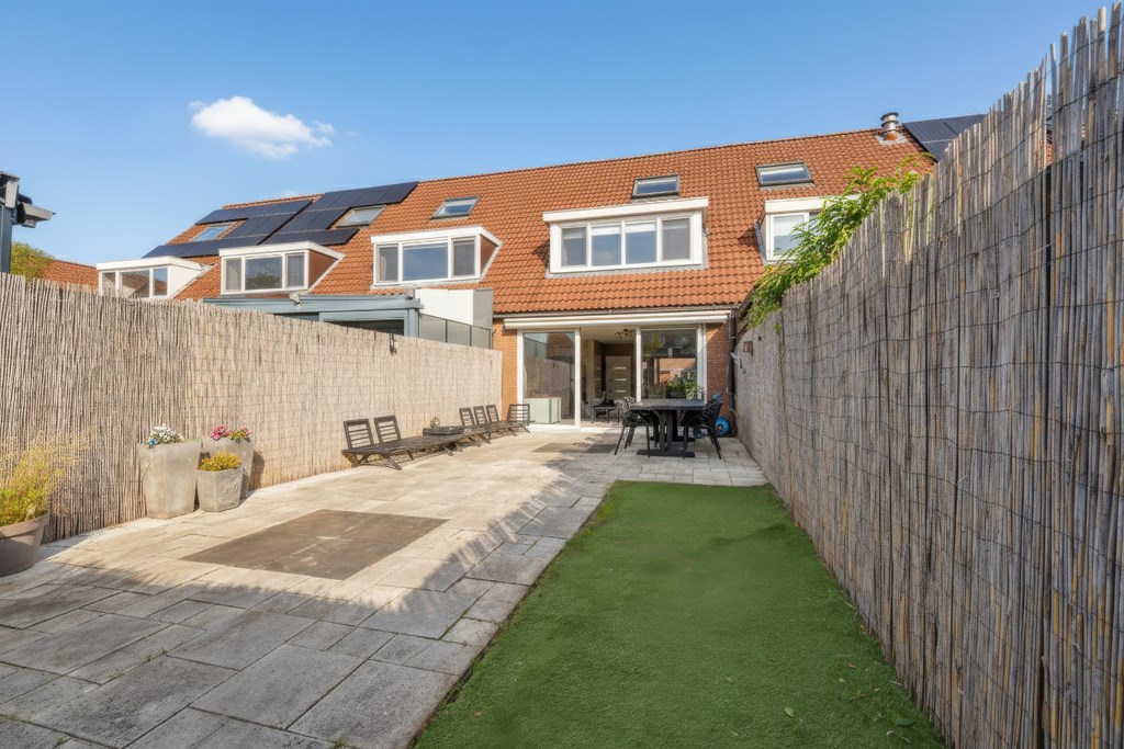 De circa 18 meter diepe achtertuin, gelegen op het zonnige zuidwesten, biedt vrijwel de hele dag zon. Achterin de tuin staat een vrijstaande houten berging. De opzet van de tuin maakt het mogelijk om de woning toekomstgericht uit te breiden, zonder afbreuk te doen aan buitenruimte.