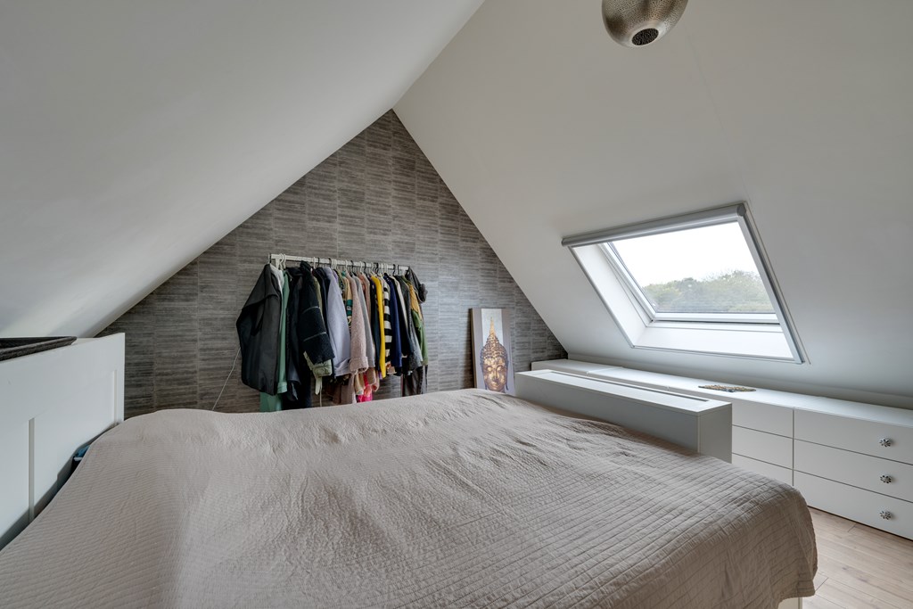De tweede verdieping beschikt over een volwaardige kamer met Velux dakraam, geschikt als slaapkamer, werkkamer of hobbyruimte. Daarnaast is hier de wasmachine- en drogeropstelling gesitueerd.