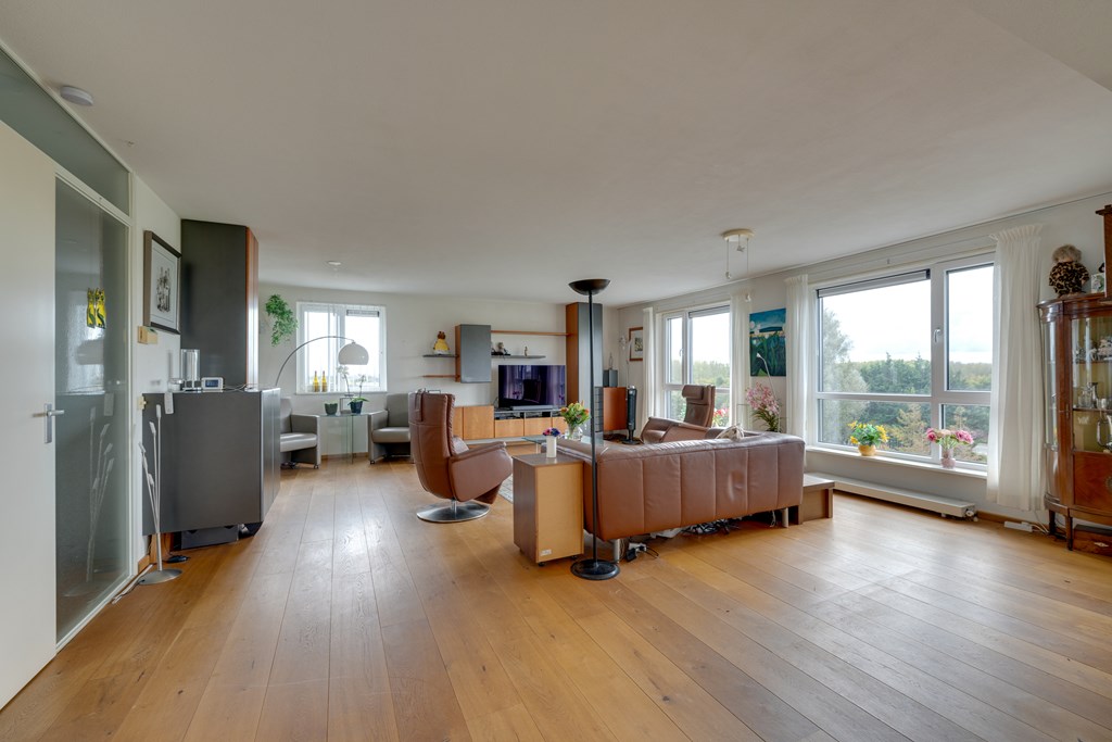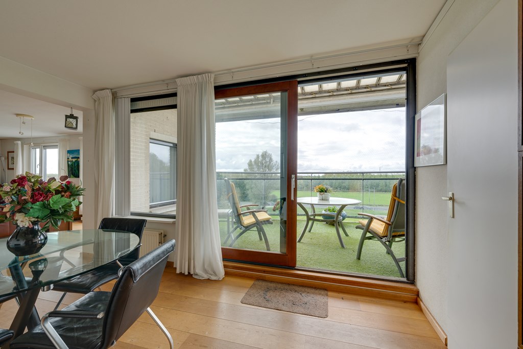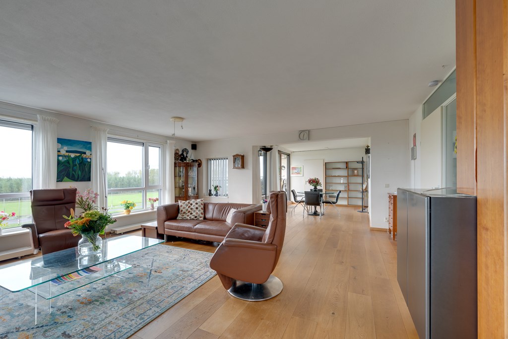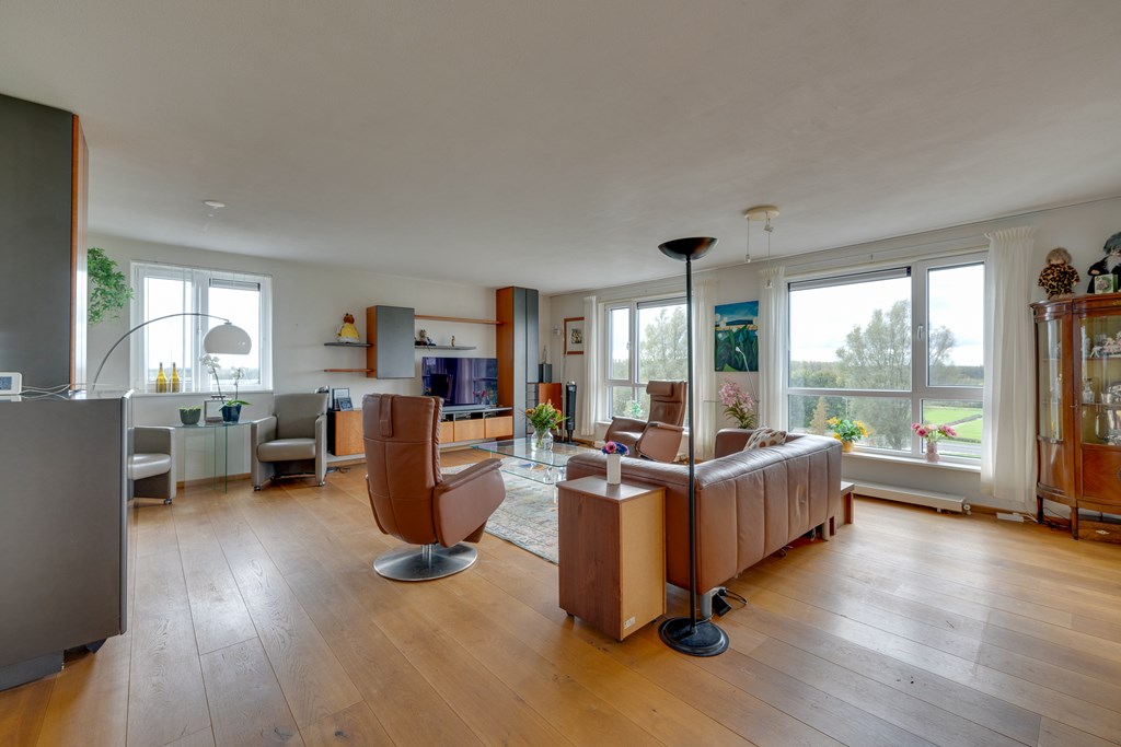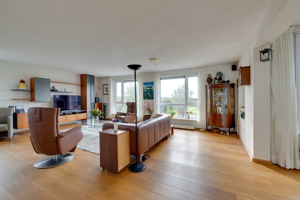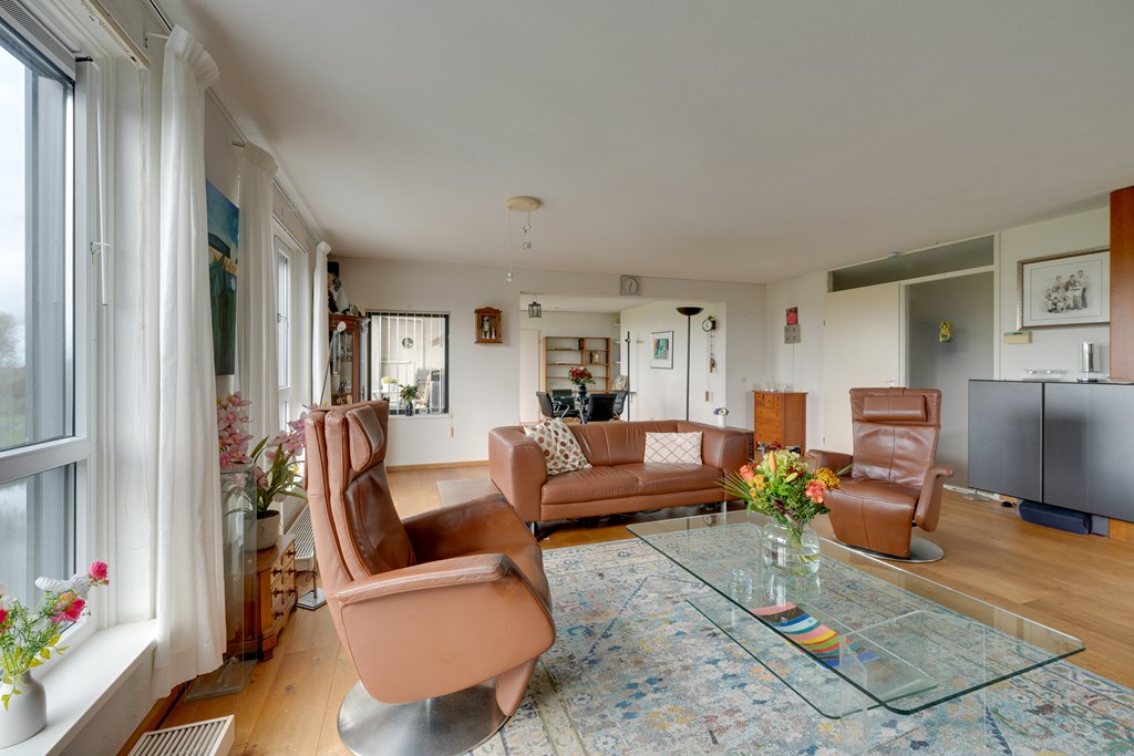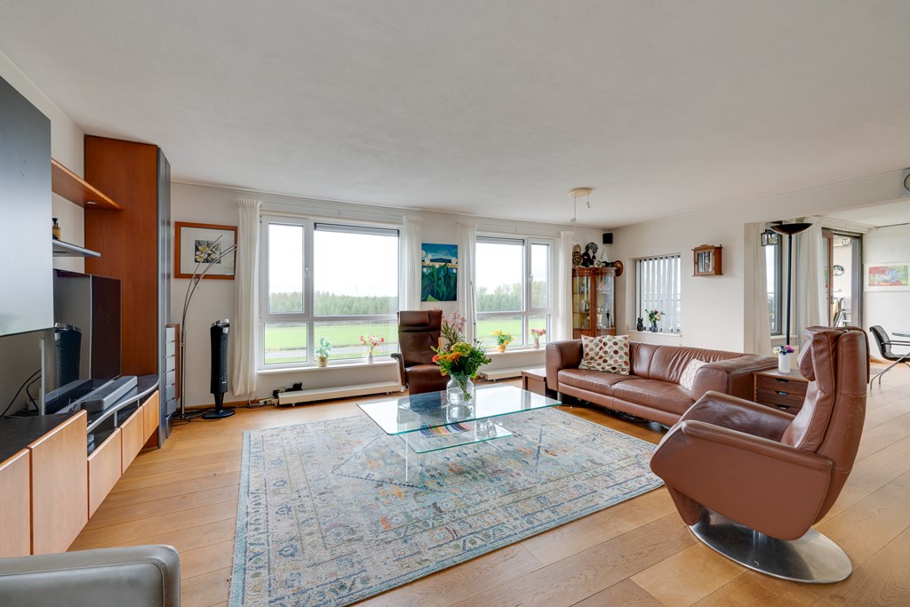 Vanuit de woonkamer en het brede balkon kijk je kilometers ver, tot aan Amsterdam en Monnickendam. Hier woon je letterlijk boven alles, met volop licht en privacy.