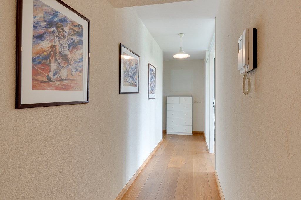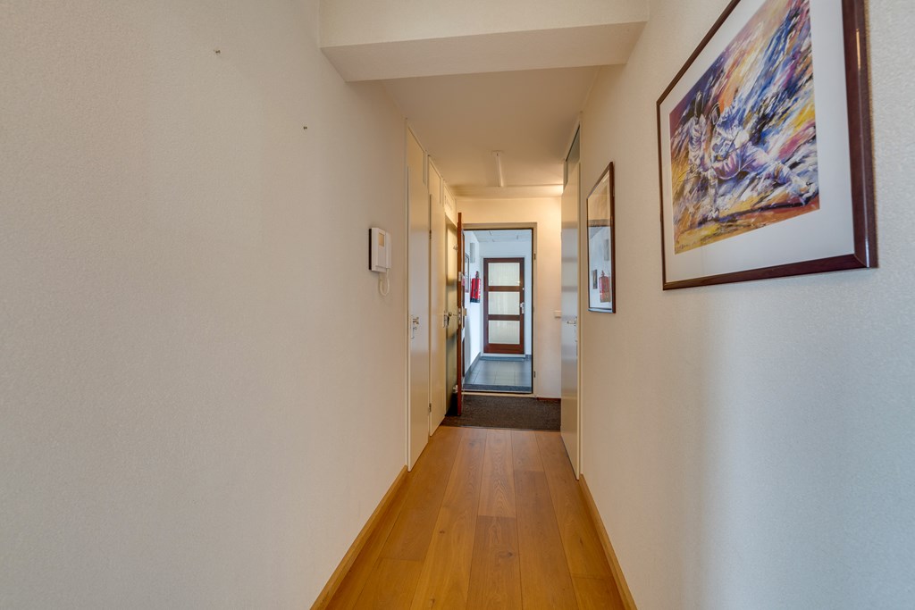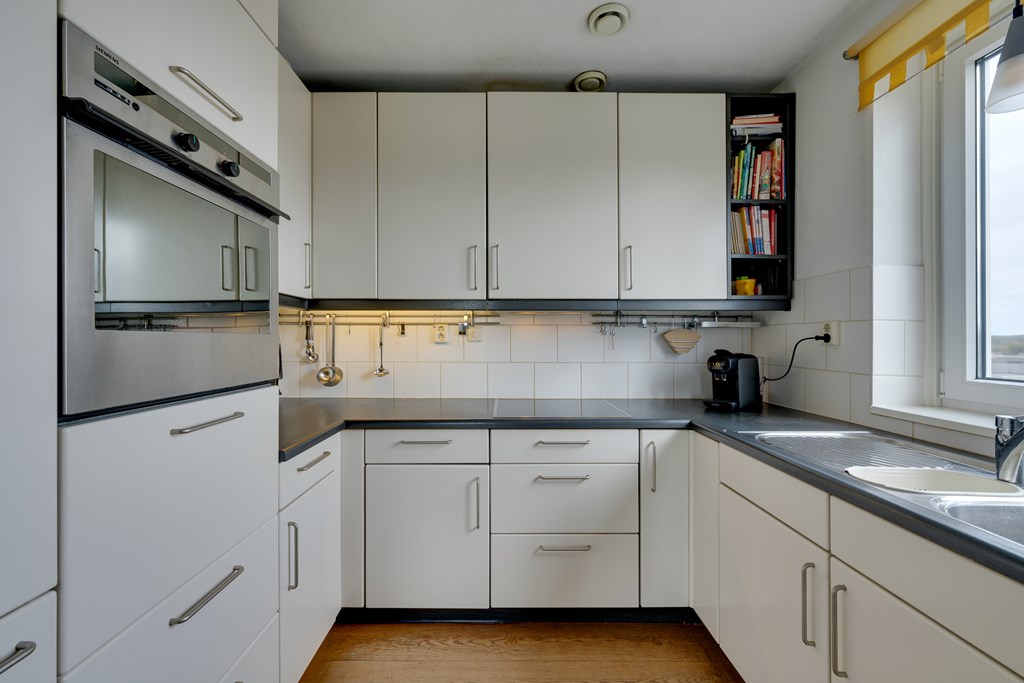 Zodra je binnenstapt, valt de royale indeling op. De lichte woonkamer heeft grote ramen en een schuifpui naar het balkon over de volledige breedte van het appartement. De open verbinding met de keuken zorgt voor een prettige leefruimte waar je gezellig kunt koken, eten en samen zijn. De keuken is eenvoudig, maar functioneel en netjes. Er ligt een houten vloer in de woning.